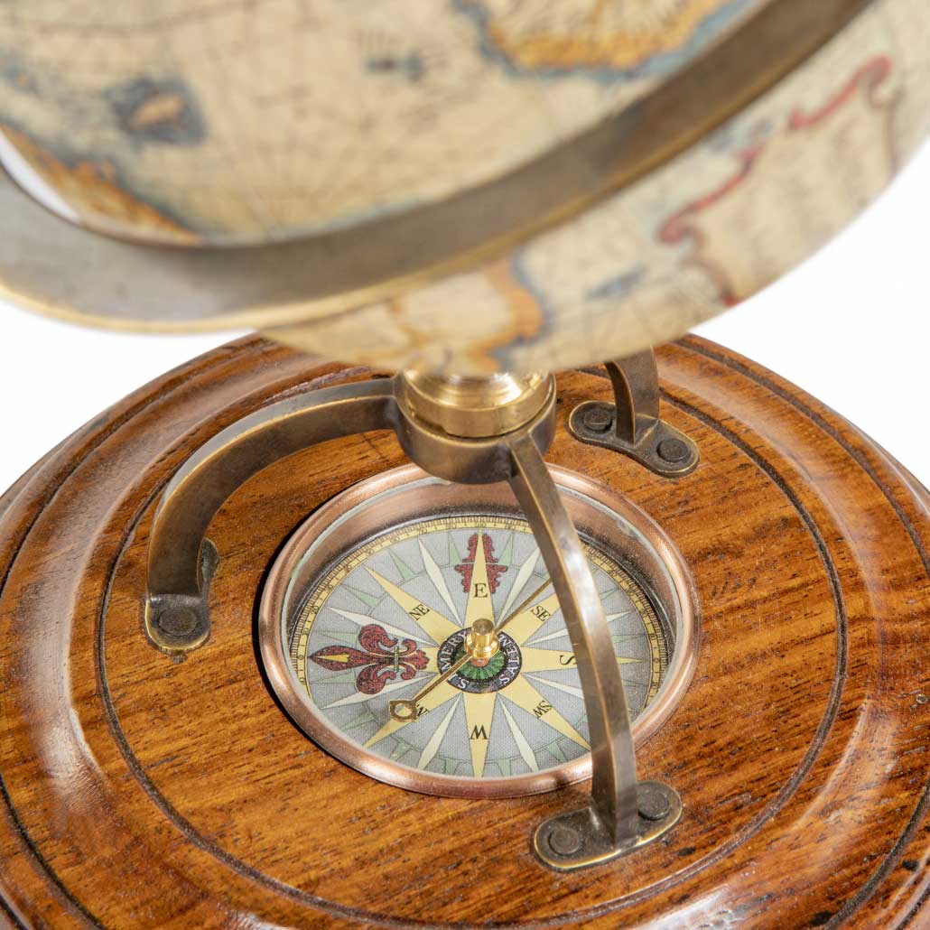 Klassische Globen ohne passenden Kompass galten als unvollständig. Unser wunderschön gearbeiteter Ständer aus Bronze und Holz mit Papierglobus enthält eine originalgetreue Nachbildung eines „trockenen” Kompasses aus dem 17. Jahrhundert. Die zwölf Papierstreifen, die auf den Globus aufgebracht sind, wurden nach Originalvorlagen von Gerardus Mercator gedruckt, dem Erfinder der Mercator-Projektion, die vom 16. bis zur Mitte des 20. Jahrhunderts verwendet wurde. Wissenschaftlich, dekorativ, historisch ...