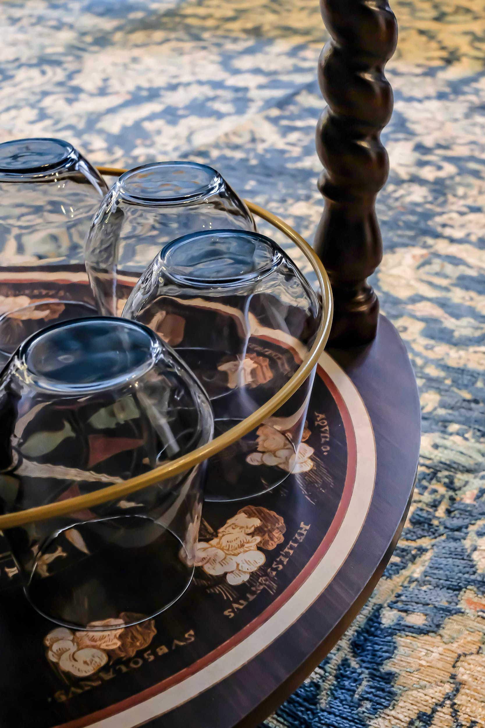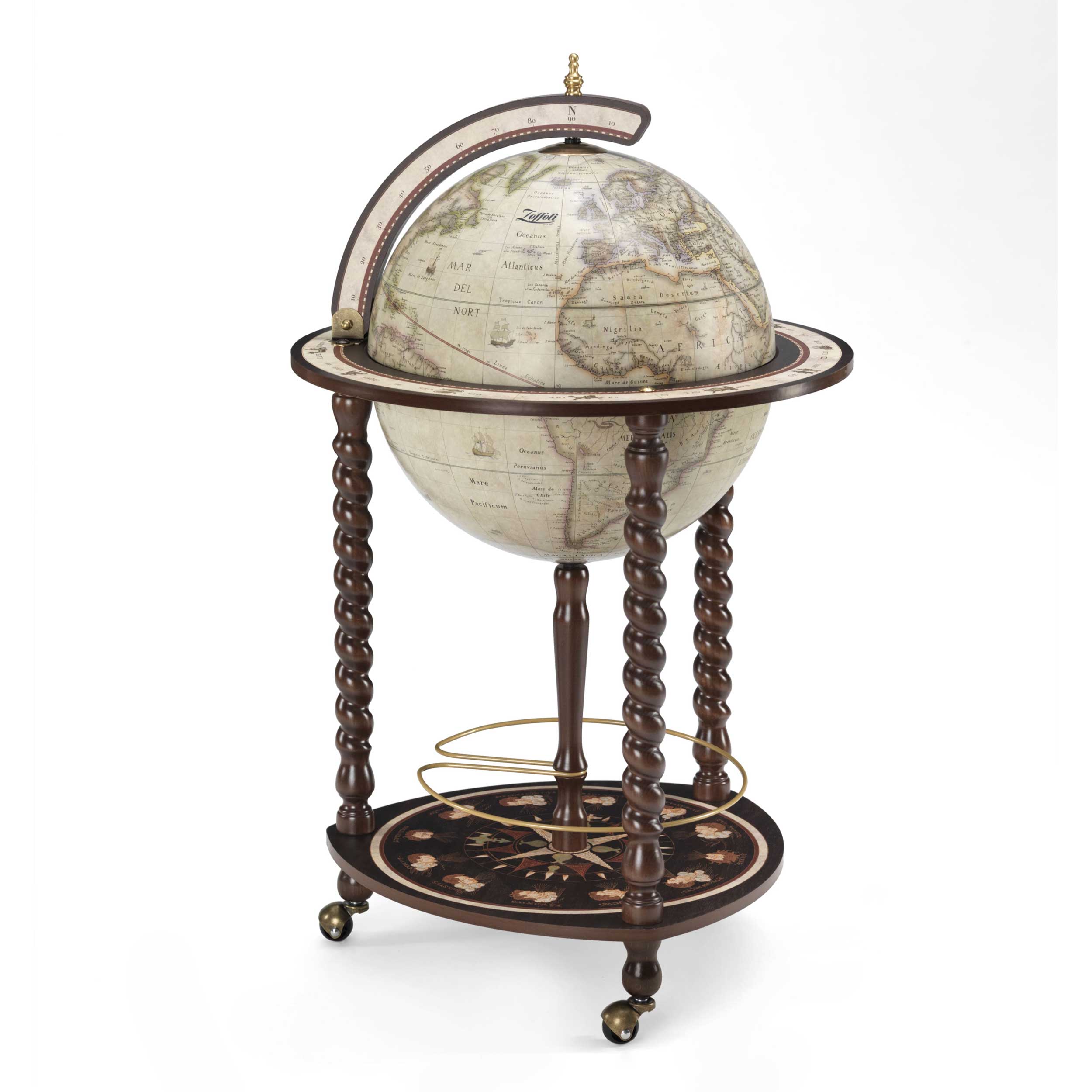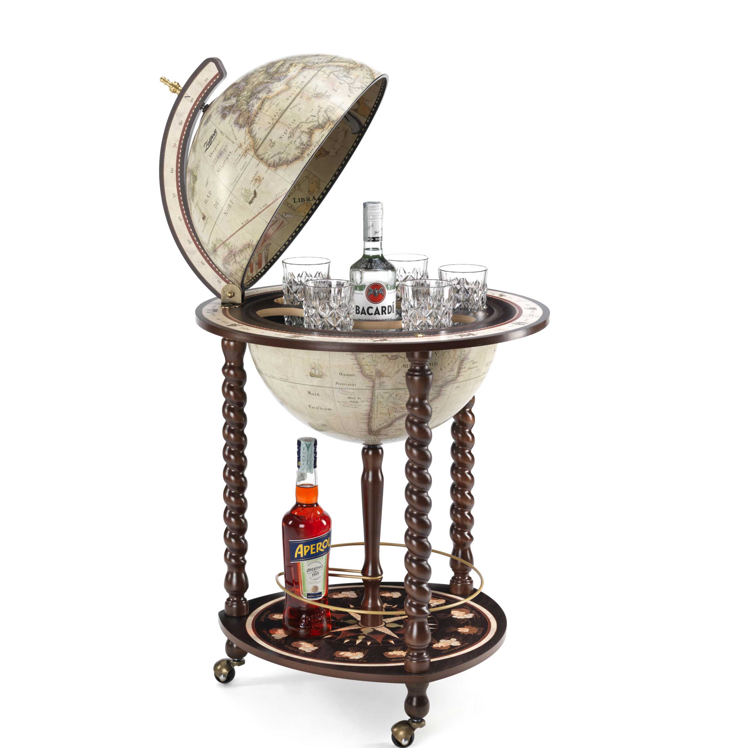 Dieser besondere Barglobus steht für zeitloses Design. Das zarte Graugrün und ein kühles Weiß, das leicht gealtert wirkt, ergeben ein reizvolles Zusammenspiel mit dem beeindruckendem Gestell im warmen Honigbraun. Die detailreiche Karte, die uns zu Reisen in das 18. Jahrhundert einlädt, zeigt in ihrem inneren mythologische Darstellungen.