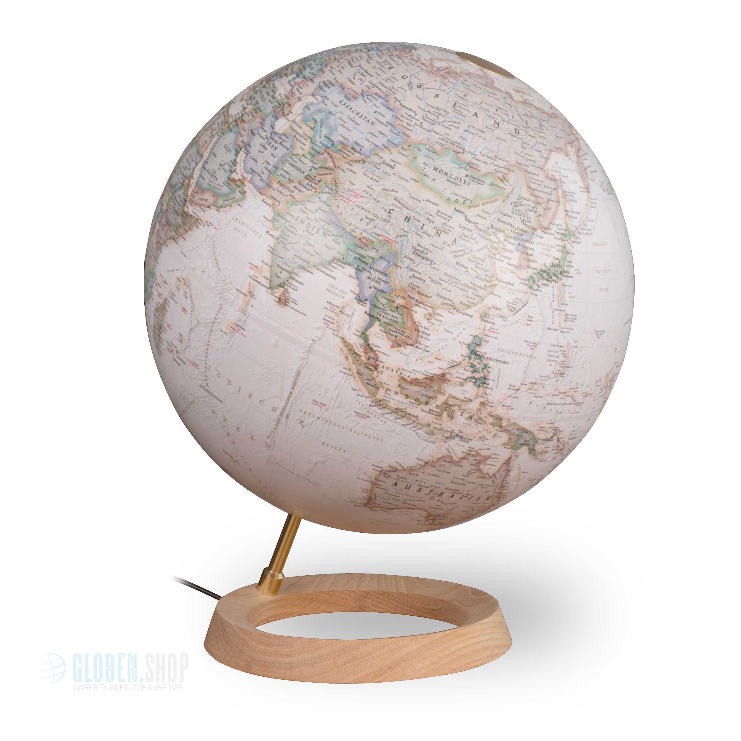 Cartography in antique style, Ø 30 cm, brass-colored diagonal support, ring-shaped base made of oak, political / physical map image, optionally in German or English