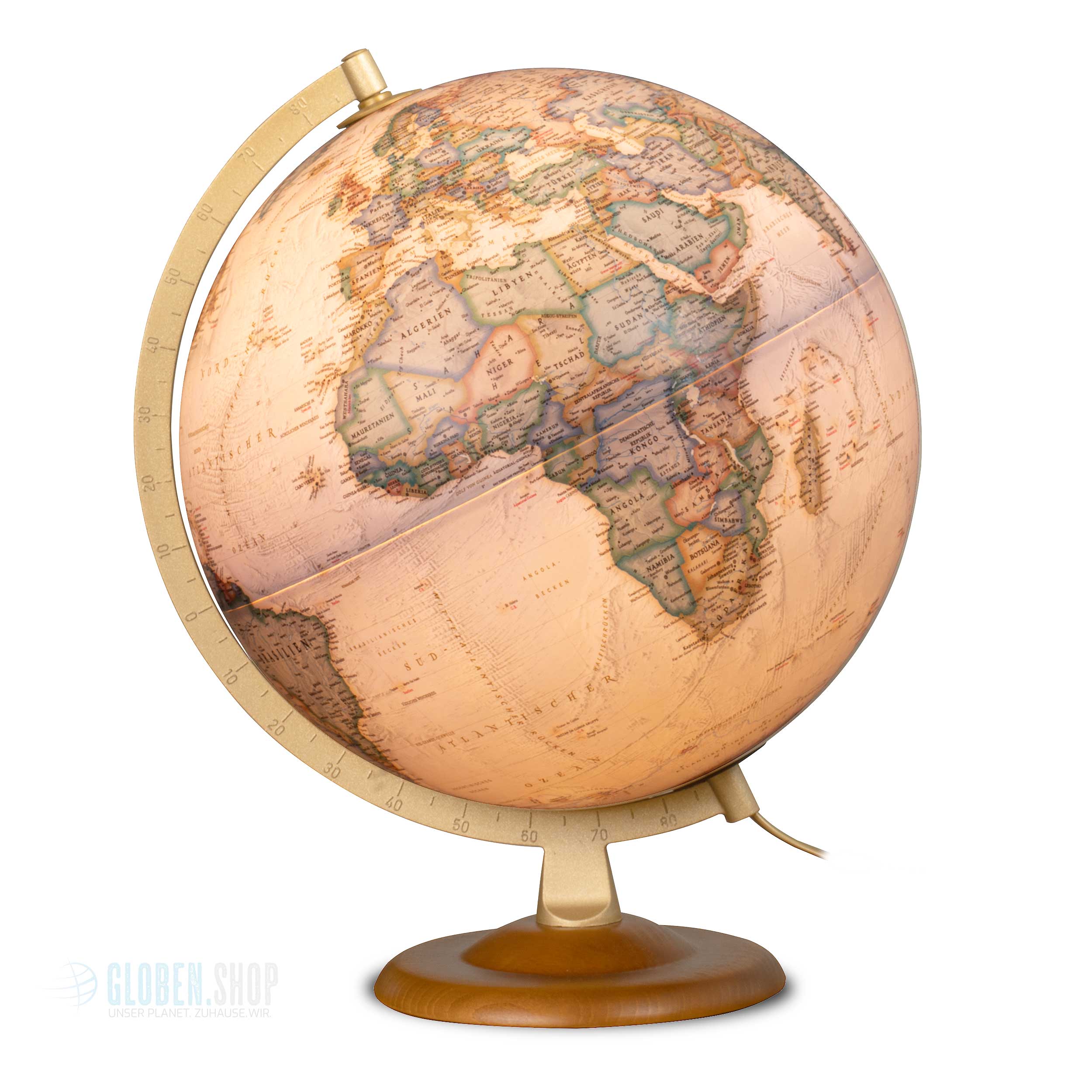 Ø 30 cm / 11,81inch, walnut-colored foot made of beech wood, brass-colored metal meridian, map image political / physical, optional German or English